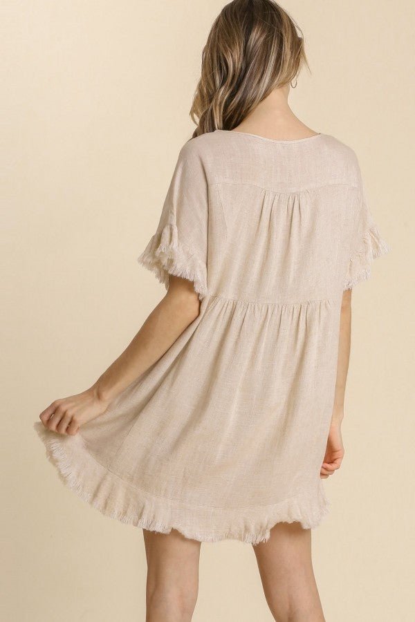 This Umgee dress is a lightweight linen blend, and it features short ruffled sleeves, a round neckline, pockets, and frayed trim. This dress look cute paired with a fun headband and a pair of wedged shoes.